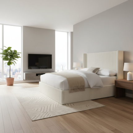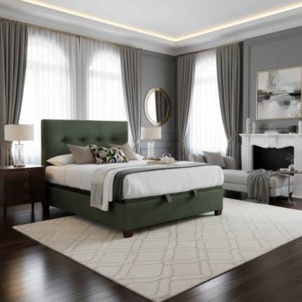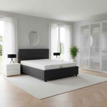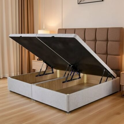 The Libra bed frame is a stylish and functional upholstered bed frame designed to maximize space with a discreet under-bed