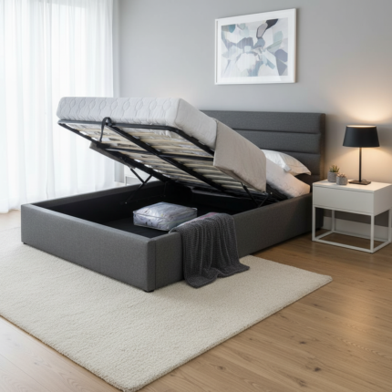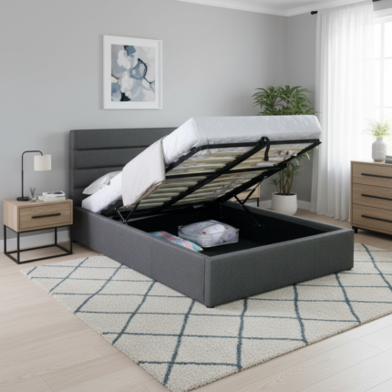 Add a touch of luxury to your room with this grey linen fabric upholstered bed. It is an ottoman storage