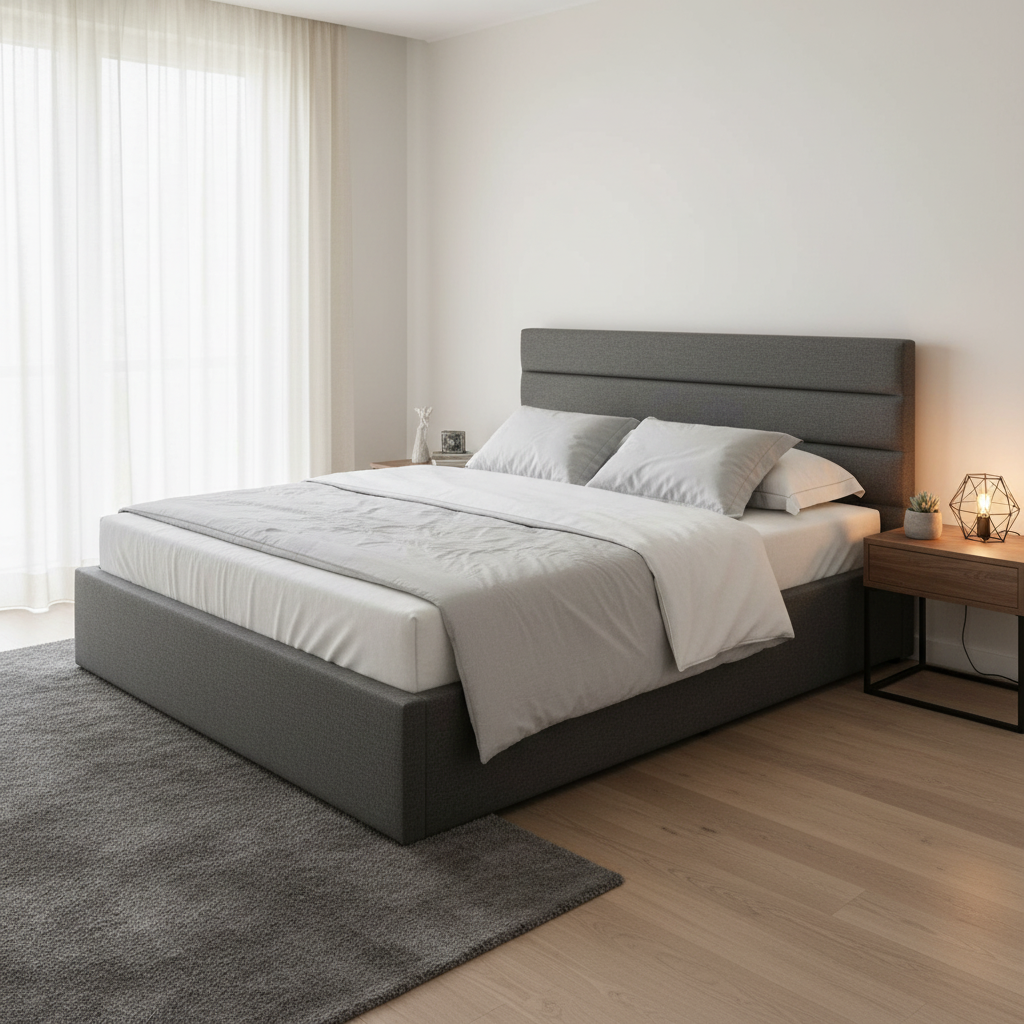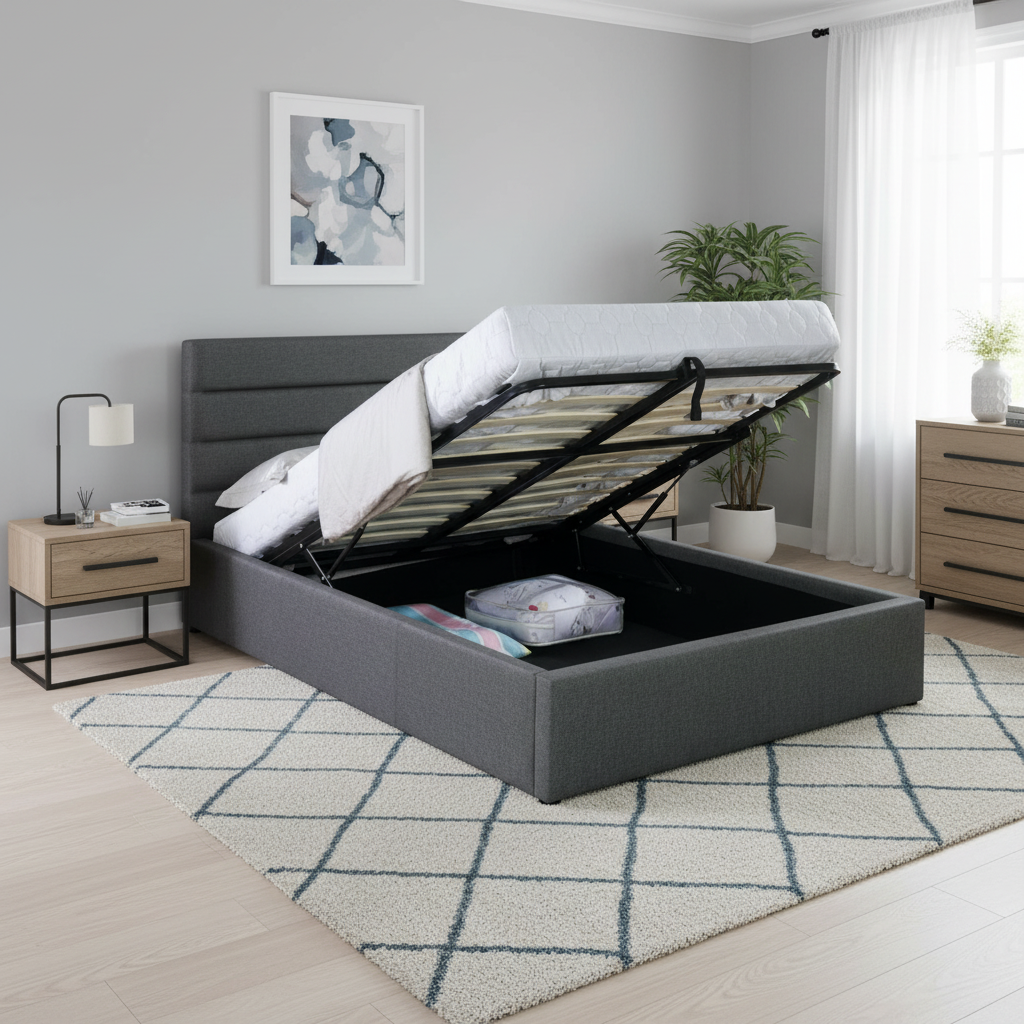Add a touch of luxury to your room with this grey linen fabric upholstered bed. It is an ottoman storage bed so all your storage needs are met with ease. A beautiful high, ridged headboard adds to its simple yet elegant style. (Available in 4’6’’ Double and 5’ King Size)